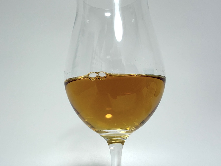 グラスに注ぐと、照明の光を吸い込んで鈍く輝く、深く濃厚なアンバー(琥珀色)が目に飛び込んできます。アルコール度数51.4%という高さからくる粘度の強さは一目でわかり、グラスを静かに回すと、内側を伝い落ちる涙(レッグス)がとてもゆっくりと、とろみを持って落ちていきます。見つめているだけで、その液体の内に秘められた圧倒的なエネルギーと濃密さを予感させてくれますね。